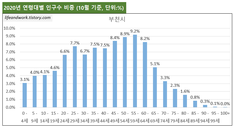 부천시의 55~54세 인구수 비중은 8.9%이며, 55세~59세의 인구 비중은 9.2% 입니다.