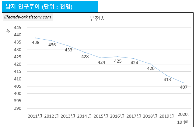 2011년 50.2% 였던 부천 지역의 남자인구 비중은 2020년 현재 49.6%를 기록하고 있습니다.