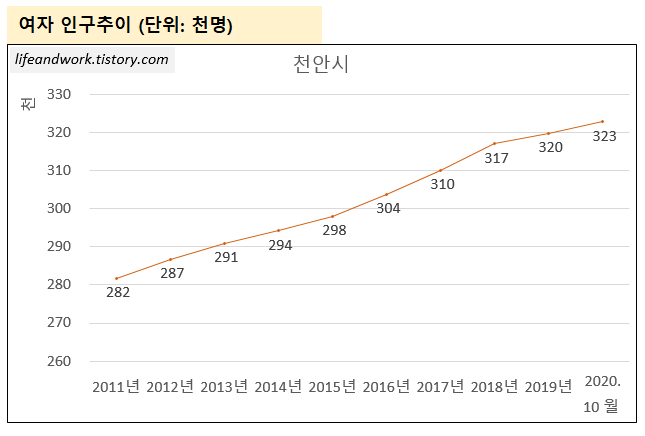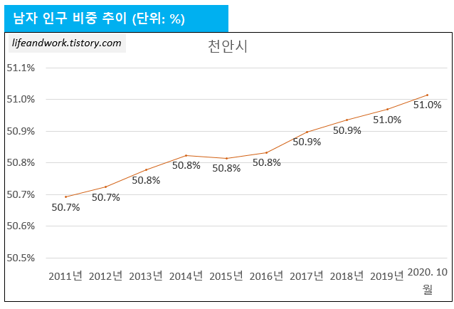 천안시 인구가 증가하면서 천안시의 여자 인구수 또한 당연히 늘어났지만, 전체 인구에서 차지하는 여자 인구수 비중은 조금씩 감소하는 추세입니다.