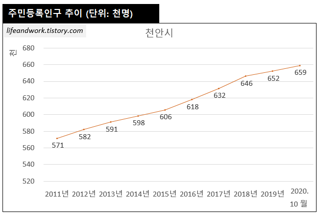 2011년 57.1만명이었던 인구는 2020년 현재 65.9만명 까지 증가하였습니다.