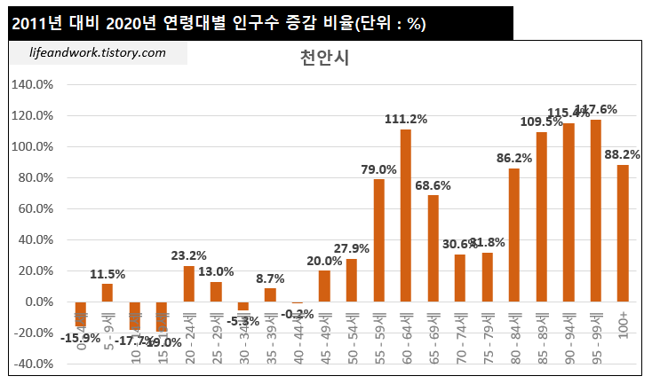 (3) 천안시 2011년 대비 2020년 연령별 인구수 변화.