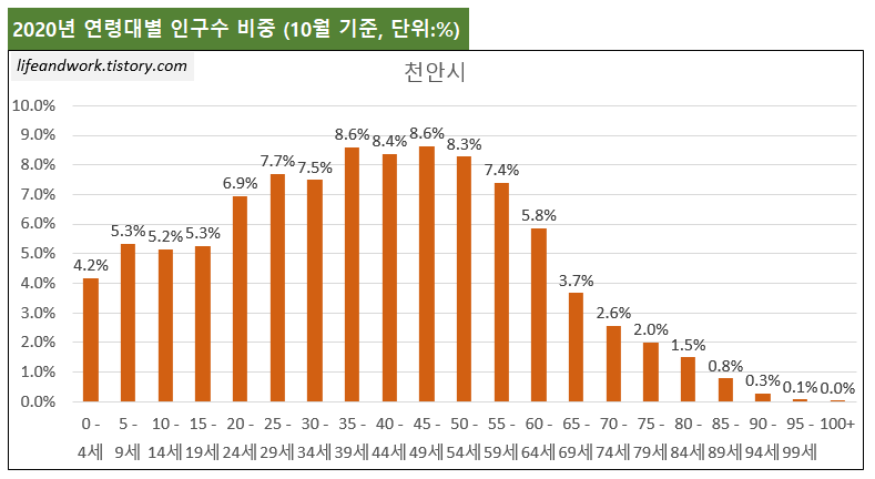 대한민국 전체적으로 50대가 주력 인구계층임을 감안할때 천안시는 비교적 특정 연령대에 몰리지 않고 분산된 인구구조를 가지고 있는 것이 특징입니다.